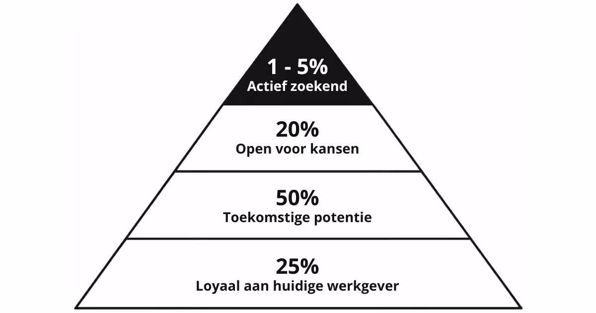 De arbeidsmarkt is groter dan veel bedrijven denken. Maximaal 5% van de mensen is actief werkzoekend. Dat zijn de kandidaten die op vacaturebanken kijken en direct willen solliciteren.